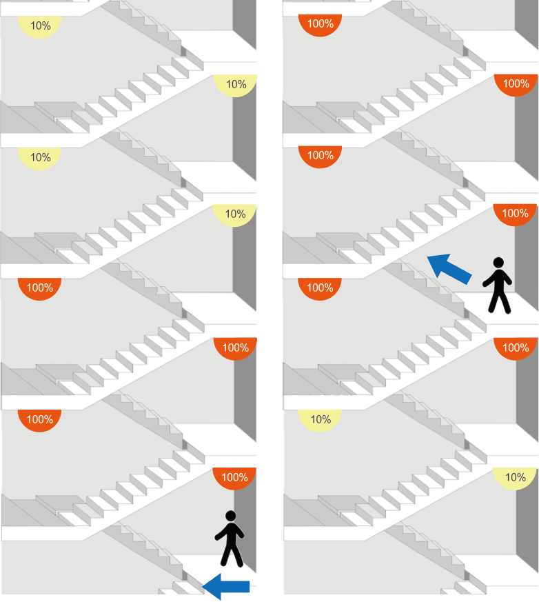 智能設計:1.人進入1樓前,預(yù)先將1-5層(樓層數量可調)燈開啟100%亮(liàng)度,不受樓層阻擋物限製。下樓是同樣的道理。隨著人上樓,始終(zhōng)保持上麵3層樓燈提前開啟(qǐ)100%亮度,